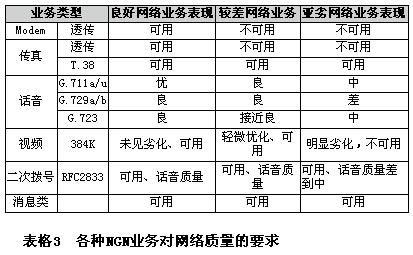 經(jīng)過(guò)試驗(yàn)測(cè)試,對(duì)不同網(wǎng)絡(luò)質(zhì)量下的NGN業(yè)務(wù)表現(xiàn)總結(jié)如下表所示: