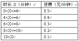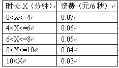 例3,國內(nèi)長途話費(fèi)在時長不超過4分鐘的情況下,按0.07元/6秒收;超過4分鐘但不超過6分鐘,統(tǒng)一按0.06元/6秒收;超過6分鐘但不超過8分鐘,統(tǒng)一按0.05元/6秒收。怀^8分鐘但不超過10分鐘,統(tǒng)一按0.04元/6秒收取;超過10分鐘,統(tǒng)一按0.03元/6秒收取。