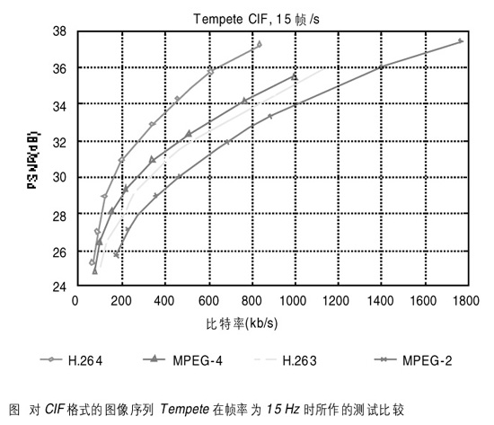 為了闡述H.264的編碼效率,我們將其與其它標(biāo)準(zhǔn)如MPEG-2、H.263、MPEG-4等作比較。使用QCIF、CIF格式的圖像序列作測試,所有編碼器都使用拉格朗日優(yōu)化技術(shù)。我們使用H.264的測試軟件JM2.0并使用了Main Profile的主要技術(shù)特征。對H.263和H.264采用的參考幀數(shù)為5,只編碼圖像序列的第一幀為I幀,每2個(gè)參考幀P之間插入2個(gè)非參考幀B。使用全搜索方式進(jìn)行32×32整數(shù)范圍的運(yùn)動(dòng)估計(jì),且由預(yù)先設(shè)定的量化參數(shù)來進(jìn)行比特率的調(diào)整。圖為對CIF格式的圖像序列Tempete在幀率為15Hz時(shí)所作的測試比較。