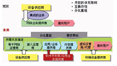 隨著市場對業(yè)務(wù)的需求越來越高,運(yùn)營商扮演業(yè)務(wù)開發(fā)者和業(yè)務(wù)提供者角色將不再能夠滿足需求,新業(yè)務(wù)的提供速度與業(yè)務(wù)的種類都逐步處于劣勢,這時(shí)運(yùn)營商需要放棄原來屬于自己的利益,從全業(yè)務(wù)提供商逐步演變?yōu)榫W(wǎng)絡(luò)提供商和網(wǎng)絡(luò)業(yè)務(wù)集成商。例如,通過與ICP/ISP的合作,構(gòu)造NGN業(yè)務(wù)價(jià)值鏈,提供包括網(wǎng)絡(luò)教育、網(wǎng)絡(luò)證券等寬帶增值服務(wù);通過開放的Parlay