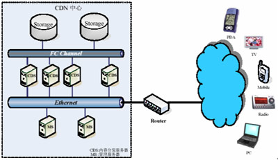從圖1中可以看出,存儲子系統(tǒng)、CDS(內容分發(fā)服務器)和MS(管理服務器)構成了整個CDN系統(tǒng)。在這個系統(tǒng)中,CDS負責內容分發(fā),直接向用戶提供數(shù)據(jù),通常以負荷分擔形式工作;MS則完成用戶及系統(tǒng)管理、負載均衡等功能,通常以熱備方式工作。