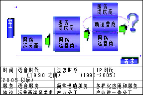 Switch(軟交換)、3G、IPv6等技術(shù)進行系統(tǒng)構(gòu)筑,全面融合先進的語音、數(shù)據(jù)及移動通信IP一體化解決方案,從而為企業(yè)提供不同需求層次的選擇。另外,由此導(dǎo)致產(chǎn)業(yè)結(jié)構(gòu)也悄悄地發(fā)生變化,產(chǎn)業(yè)朝三層級和多層級演變通信的新結(jié)構(gòu)和新角色:服務(wù)運營商的誕生,網(wǎng)絡(luò)運營商向服務(wù)提供商的轉(zhuǎn)型。