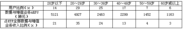 與競爭對手SKT一樣,KTF針對不同年齡段的用戶建立了個性化的獨立服務品牌,這些服務品牌分別是BiGi(主要針對13~18歲的未成年人)、Na(主要針對18~25歲的青年學生)、Main(針對25~35歲的男性用戶)、Hyo(針對35歲以上用戶)以及DRAMA(針對所有年齡的女性用戶)。從各年齡用戶群的業(yè)務使用情況看,占總用戶43%的30歲以下年輕用戶是KTF最主要的數(shù)據(jù)與增值業(yè)務消費群體。見表4。