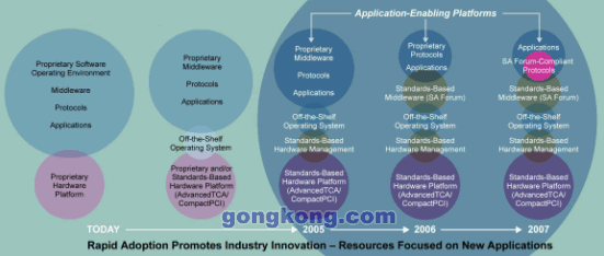計(jì)算機(jī)和通信業(yè)已經(jīng)堅(jiān)定的向開放標(biāo)準(zhǔn)演進(jìn)。例如,Linux已經(jīng)被作為OS大量采用,計(jì)算模塊已經(jīng)遵循各種規(guī)范標(biāo)準(zhǔn)來設(shè)計(jì),具有標(biāo)準(zhǔn)接口,如CPCI和ATCA。如果TEM繼續(xù)采用目前的方法集成計(jì)算機(jī)硬件和軟件模塊,全面標(biāo)準(zhǔn)化將是一個緩慢延進(jìn)的過程。下一步將是基于標(biāo)準(zhǔn)的硬件平臺管理,最終可能在本年代末,遵循SAF的中間件及其上運(yùn)行的應(yīng)用。
