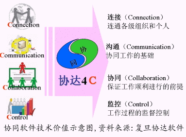 V4.0 ,協(xié)同軟件圍繞著構(gòu)建網(wǎng)上虛擬工作場(chǎng)所,在IT應(yīng)用上所體現(xiàn)的價(jià)值,主要是4C,即:"連接Connection、溝通Communication、協(xié)作Collaboration、監(jiān)控Control",這也是協(xié)同軟件的主要IT技術(shù)價(jià)值的體現(xiàn)。