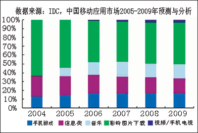 與彩鈴服務(wù)相比,圖片下載、彩信業(yè)務(wù)由于受到手機價格等因素的影響,近兩年的推廣不是很順利。IDC中國電信研究部經(jīng)理級分析師王彥認(rèn)為,隨著彩屏手機終端的體積和價格都有所下降,彩信業(yè)務(wù)在今后兩年將呈現(xiàn)一個較好的發(fā)展趨勢,IDC預(yù)測該業(yè)務(wù)的未來五年CAGR將達到12.5%。