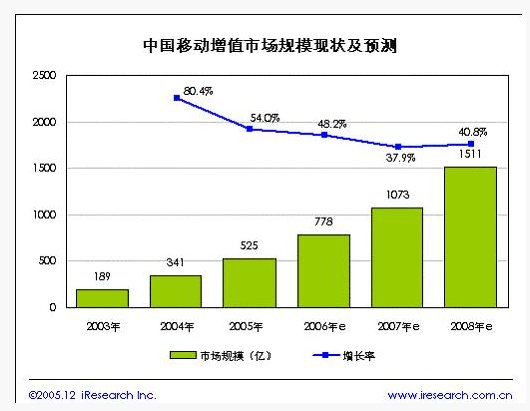隨著中國移動(dòng)電話用戶的不斷增長(zhǎng)和移動(dòng)增值服務(wù)的不斷發(fā)展創(chuàng)新,移動(dòng)增值服務(wù)已經(jīng)成為現(xiàn)隨著市場(chǎng)的發(fā)展和不斷規(guī)范,中國移動(dòng)增值服務(wù)市場(chǎng)將進(jìn)入相對(duì)平穩(wěn)的發(fā)展階段。據(jù)iResearch預(yù)測(cè),中國移動(dòng)增值服務(wù)的市場(chǎng)規(guī)模增長(zhǎng)速度將逐年減緩,到2008年受奧運(yùn)會(huì)影響增長(zhǎng)速度提高,規(guī)模將突破1500億元。