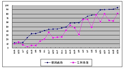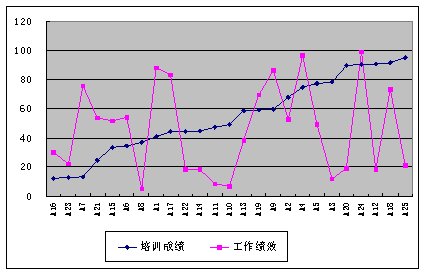 我們通過分析,圖3顯示,員工的培訓成績和其工作績效是無關(guān)的,這說明培訓是無效的。無效的原因也許是由于培訓內(nèi)容不合理或培訓組織實施不善等原因,總之培訓是無效的,需要改進。