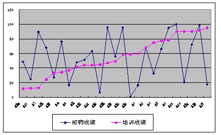 相反,如果培訓成績和工作績效的關(guān)系如圖5,從中我們可以看出,培訓的成績和招聘的成績表現(xiàn)出很強的正相關(guān),說明培訓成績好的人,其工作績效相應好,培訓成績差的人,其工作績效也差,說明培訓是有效的。