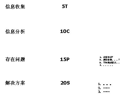 Tables)以及相應(yīng)的收集方法和時(shí)間;第二步是信息分析,明確了如何將已收集的5T(5 Tables)轉(zhuǎn)換成10張圖(10 Charts)以便進(jìn)一步分析;第三步是發(fā)現(xiàn)存在問(wèn)題,明確了如何從10C(10