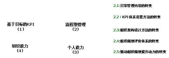 在圖1中最關(guān)鍵的部分為圖中的第(2)部分,即流程型管理的部分,是流程型管理能否成功實施的關(guān)鍵,也是最復(fù)雜、最困難的部分,很多公司流程型管理的失敗大都是由于這一部分沒有做好。根據(jù)筆者的長期實踐,組織要成功實現(xiàn)向“流程型”管理的轉(zhuǎn)變,必須同步實現(xiàn)以下五個方面的轉(zhuǎn)變: