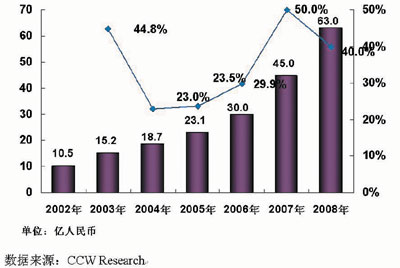 圖 2002—2008年中國(guó)視頻會(huì)議系統(tǒng)市場(chǎng)規(guī)模