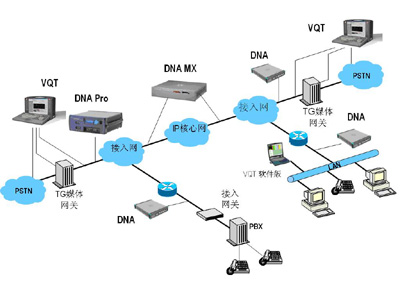 以上兩種測試方法也可以結合使用,在進行端到端VQT測試時,在NGN網(wǎng)絡的中間網(wǎng)段(根據(jù)需要可以設置多個監(jiān)測點)部署分布式網(wǎng)絡分析儀(DNA),進行被動式RTP/RTCP監(jiān)測,從而判斷出造成語音質(zhì)量下降的環(huán)節(jié)所在。如下圖所示: