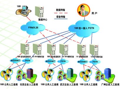 2、分布式接入服務(wù)功能:"企業(yè)客戶服務(wù)系統(tǒng)"為企業(yè)分布式的人工座席提供接入服務(wù)。當(dāng)某個(gè)城市的消費(fèi)者在使用168電話中自動語音應(yīng)答功能時(shí),只要按"0"號鍵,電話就會被轉(zhuǎn)到企業(yè)在的當(dāng)?shù)胤⻊?wù)人員座席上,由專業(yè)人員來提供服務(wù)支持。此種功能適合于在多個(gè)城市設(shè)立人工座席的企業(yè)用戶。