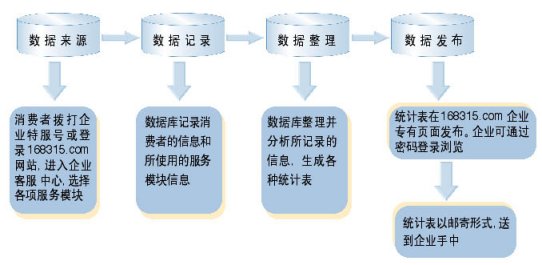 "企業(yè)客戶服務(wù)系統(tǒng)"統(tǒng)計(jì)數(shù)據(jù)分析功能,能幫助企業(yè)管理人員適時(shí)監(jiān)控"企業(yè)客戶服務(wù)系統(tǒng)"的運(yùn)行情況,自動采集消費(fèi)者在使用"企業(yè)客戶服務(wù)系統(tǒng)"過程的相關(guān)數(shù)據(jù),并分類整理成數(shù)據(jù)庫,為企業(yè)經(jīng)理人投資決策提供重要的數(shù)據(jù)支持。企業(yè)經(jīng)理人只需登陸客戶服務(wù)網(wǎng)站www.168315.com,按照"168315客戶服務(wù)中心"提供的用戶名和密碼登錄,即可隨時(shí)下載"企業(yè)客戶服務(wù)系統(tǒng)"的運(yùn)行數(shù)據(jù),瀏覽客戶檔案庫。也可以由"中心"的服務(wù)人員將統(tǒng)計(jì)結(jié)果通過E-mail、傳真或郵寄的方式送到企業(yè)經(jīng)理人手中,如下圖: