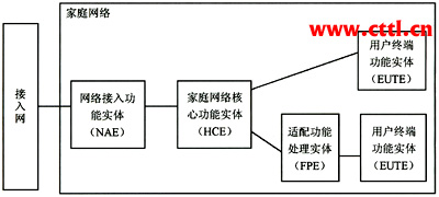 家庭網(wǎng)絡(luò)的參考模型如圖1所示。家庭網(wǎng)絡(luò)內(nèi)部的邏輯功能實體有4個,包括: