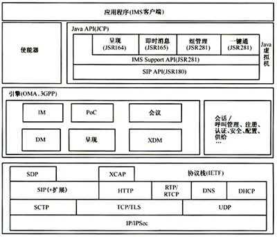 通過(guò)對(duì)于IMS客戶端相關(guān)規(guī)范的研究與分析,可以看出IETF提供了IMS客戶端所需要的協(xié)議部分,包括詳細(xì)的SIP信令消息交互,服務(wù)參數(shù)協(xié)商、媒體流的建立、XML文檔的交互等。3GPP和OMA提供了IMS客戶端所需要的服務(wù)引擎,與不同應(yīng)用服務(wù)器之間的交互方式以及如何接入到IMS網(wǎng)絡(luò)等。JCP提供了一整套IMS客戶端上Java應(yīng)用程序所需的標(biāo)準(zhǔn)Java應(yīng)用編程接口。由此可以總結(jié)歸納出IMS客戶端軟件架構(gòu)參考,具體參見(jiàn)圖2。