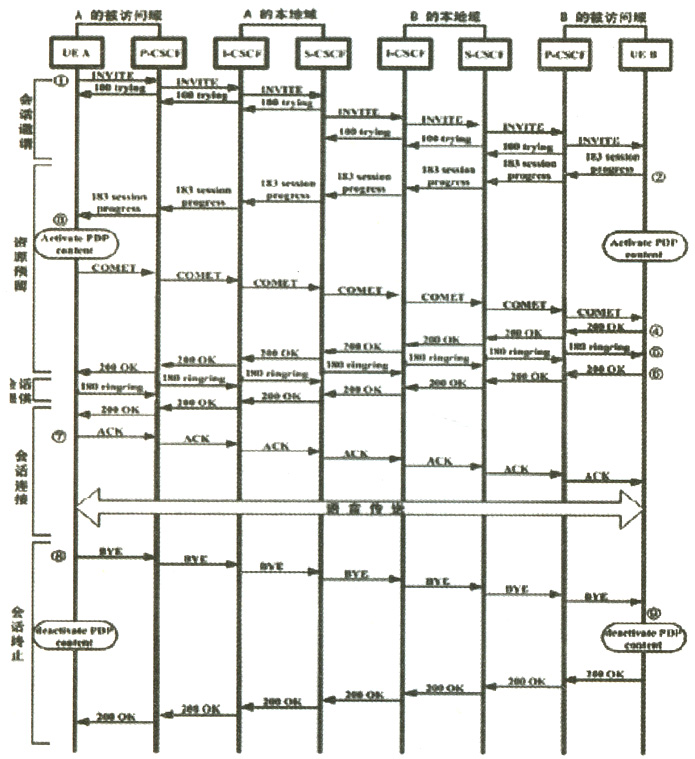 B接受了這個(gè)會(huì)話請(qǐng)求,但此時(shí)他不回鈴?fù)ㄖ狝,他返回183sessionprocess應(yīng)答表示他接受該會(huì)話,同時(shí)要求A對(duì)此表示確定,這個(gè)應(yīng)答通過(guò)各個(gè)CSCF傳給A。同時(shí)B激活一個(gè)GPRSPDP上下文,它被用來(lái)通過(guò)IMS的IP接入點(diǎn)來(lái)建立語(yǔ)音通道。