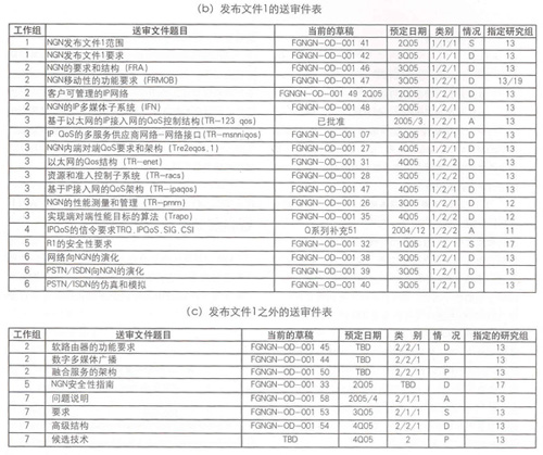 2005年5月之前,下一代網(wǎng)絡(luò)重點(diǎn)工作組已完成了計(jì)劃中的26個(gè)送審文件中的3個(gè)。所有的送審文件都必須指定專門(mén)的發(fā)布文件。遵循第13研究組的決定,下一代網(wǎng)絡(luò)重點(diǎn)工作組至少應(yīng)完成發(fā)布文件1的送審稿。表2給出了下一代網(wǎng)絡(luò)重點(diǎn)工作組按發(fā)布文件分類的送審件。