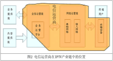 根據(jù)以上的分析,可以看出,電信運(yùn)營(yíng)商在IPTV產(chǎn)業(yè)鏈中居于主導(dǎo)地位,但與廣電部門的關(guān)系仍然需要理順,才能真正在IP網(wǎng)絡(luò)上發(fā)展好視頻類業(yè)務(wù)。圖2示意了電信運(yùn)營(yíng)商在IPTV中的位置。