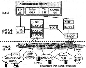 一般IMS分為三層,應用層支持各類應用服務器,負責為用戶提供增值業(yè)務和第三方業(yè)務。會話及呼叫控制層負責管理呼叫或會話設置,其中呼叫會話控制模塊CSCF完成呼叫網(wǎng)關功能、呼叫業(yè)務觸發(fā)功能和路由選擇功能,將SIP信令消息正確地轉發(fā)到應用服務器。歸屬用戶服務器HSS用于維護每個終端用戶獨有的業(yè)務屬性,包括IP地址、漫游信息、好友列表、呼叫業(yè)務定制信息及語音郵件設置等。HSS是全網(wǎng)可用資源。媒體資源功能MRF包括MRFP和MRFC,負責提供及控制媒體流資源,如播放通知音、媒體流的混合、編解碼等。媒體網(wǎng)關控制MGCF負責PSTN承載與IP流之間的連接,根據(jù)被叫號碼和來話情況選擇CSCF,并完成PSTN與IMS之間的呼叫控制協(xié)議轉換,如將從CSCF接收到的SIP消息轉換為MEGACO或ISUP消息,并通過IP發(fā)送到信令網(wǎng)關SGW。出口網(wǎng)關控制功能BGCF主要實現(xiàn)呼叫路由功能,為呼叫選擇適當?shù)腜STN接口點,若發(fā)現(xiàn)該接口點與自己在同一網(wǎng)絡,則選擇本網(wǎng)絡的MGCF與PSTN交互,若發(fā)現(xiàn)接口點在另一網(wǎng)絡時,BGCF將會話信令轉發(fā)給另一網(wǎng)絡相應的BGCF。一個IMS可以包含一個或多個CSCF、HSS、MGCF等功能模塊。傳送及接入層承載各種類型之間的轉換,完成與傳統(tǒng)PSTN/PLMN間的互通等功能,包括各類有線接入、無線接入、互聯(lián)互通網(wǎng)關等設備。