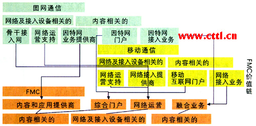 總之,在FMC新配置的價(jià)值鏈中,應(yīng)用和內(nèi)容的作用非常重要,因?yàn)樗麄冊(cè)谌诤蠒r(shí)將價(jià)值鏈中的各個(gè)部分連接起來。因此,可以認(rèn)為內(nèi)容和應(yīng)用的建立、積累將會(huì)推動(dòng)增值FMC業(yè)務(wù)的發(fā)展。今后隨著在內(nèi)容和業(yè)務(wù)領(lǐng)域?qū)⒊霈F(xiàn)更多不同的參與者,如內(nèi)容提供商、應(yīng)用提供商和中間件提供商,F(xiàn)MC價(jià)值鏈將進(jìn)一步得到更深層次的合作、擴(kuò)張和合并。這些在新的價(jià)值鏈中出現(xiàn)的更多獨(dú)立但又不同的實(shí)體,將直接反映FMC融合的特征。