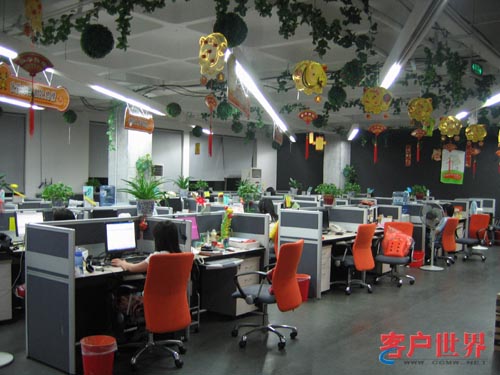 整個(gè)服務(wù)現(xiàn)場的裝修以桔黃色為主色調(diào),代表溫暖、和諧;格局不規(guī)則化,盡顯現(xiàn)代時(shí)尚的風(fēng)格;辦公室到處是綠色植物,墻上貼滿了各種相片、海報(bào)和宣傳語,天花板掛滿了激勵(lì)口號板;別具特色的洗手間文化;乒乓球室、休息室、休閑吧,咖啡機(jī)、茶葉、果汁、雪糕、飲料,魚缸、大液晶電視、音響……一點(diǎn)感覺不到這是一個(gè)枯燥的呼叫中心的工作環(huán)境。