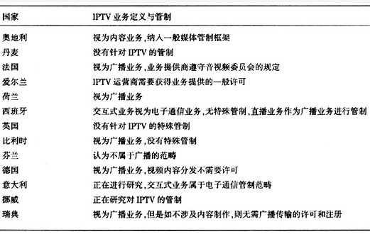 歐盟在1997年發(fā)表的融合綠皮書《邁向信息社會(huì)之路》中明確指出不同的網(wǎng)絡(luò)平臺(tái)都能一同傳送電話信息、電視信息、電腦信息和數(shù)據(jù),并于2003年開始實(shí)施《電子通信網(wǎng)絡(luò)與服務(wù)的統(tǒng)一監(jiān)管框架》,1997年融合指令和2003年統(tǒng)一監(jiān)管框架推動(dòng)了歐盟各國(guó)業(yè)務(wù)融合的發(fā)展,歐盟大多數(shù)國(guó)家均開放了有線電視和電信市場(chǎng),允許彼此進(jìn)入。在實(shí)現(xiàn)管制融合的國(guó)家,對(duì)電信運(yùn)營(yíng)商提供IPTV基本沒(méi)有準(zhǔn)入方面的限制。但是由于各國(guó)對(duì)IPTV定義和認(rèn)識(shí)的不同。IPTV所屬的業(yè)務(wù)類別也有所差異,從而帶來(lái)了管制上的差別。