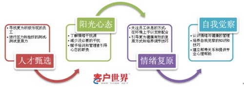 在上述的這三類(lèi)員工中,我們更希望培養(yǎng)的是第一類(lèi),最不想見(jiàn)到的是第三類(lèi)。但天生就具有很強(qiáng)情緒管理能力的員工,是可望不可求的。如果僅僅是依賴(lài)人員的天賦,管理也會(huì)陷入更多的“surprise”中,在幾百上千人的呼叫中心出現(xiàn)不可控的局面。我們需要的,也許是個(gè)系統(tǒng)化的工程,能夠直面呼叫中心員工需要“情緒勞動(dòng)”的特點(diǎn),從另外一個(gè)角度去理解和改善員工的表現(xiàn),梳理各項(xiàng)相關(guān)工作,按照如下的步驟形成員工支持體系: