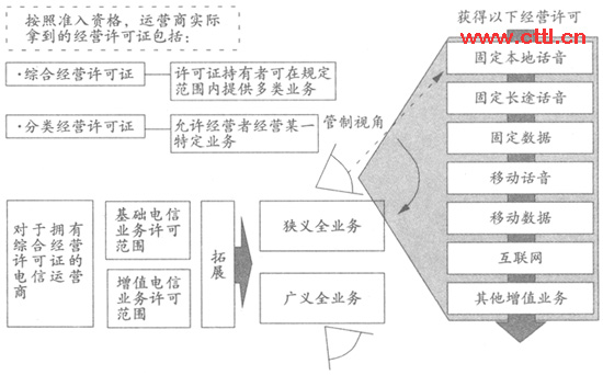 全業(yè)務(wù)可從電信管制、業(yè)務(wù)屬性及市場(chǎng)三個(gè)角度進(jìn)行定義。全業(yè)務(wù)運(yùn)營(yíng)則可以從兩個(gè)角度來(lái)看待,一是從管制視角帶來(lái)的狹義全業(yè)務(wù);一是從多業(yè)務(wù)領(lǐng)域與電信結(jié)合的廣義全業(yè)務(wù)。具體表述可參照?qǐng)D1。