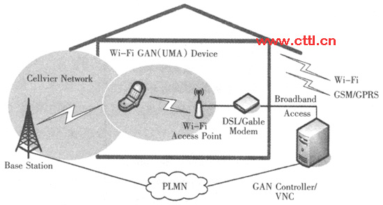 (3)終端融合。終端融合主要是指能夠提供固定和移動(dòng)網(wǎng)絡(luò)連接的智能終端(見(jiàn)圖3),用戶采用多模終端后,可以根據(jù)自己的意愿選擇接入最適合的網(wǎng)絡(luò):固定或移動(dòng)網(wǎng)絡(luò),而網(wǎng)絡(luò)本身也可以智能地根據(jù)用戶的接入方式作出最佳的動(dòng)作。