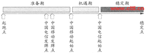 - 被動(dòng)期是指從中國(guó)電信首發(fā)業(yè)務(wù)起始點(diǎn)到中國(guó)移動(dòng)進(jìn)行全業(yè)務(wù)運(yùn)營(yíng)起始點(diǎn)這段時(shí)期。這其中包含了中國(guó)電信發(fā)牌時(shí)間點(diǎn)和中國(guó)移動(dòng)發(fā)牌時(shí)間點(diǎn)。