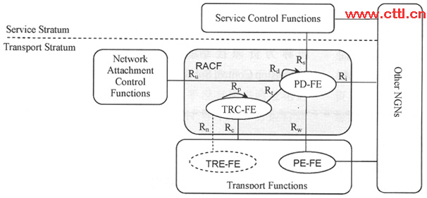 RACF由策略決策功能實體PD-FE和傳送資源控制功能TRC-FE兩個功能實體組成。PD-FE基于網(wǎng)絡(luò)策略規(guī)則、業(yè)務(wù)控制功能SCF提供的業(yè)務(wù)信息、網(wǎng)絡(luò)附著控制功能NACF提供的傳送層簽約信息,以及TRC-FE提供的資源接納決策結(jié)果,做出網(wǎng)絡(luò)資源接納控制的最后決策。可以基于每個流對傳送層的策略執(zhí)行功能實體。PE-FE下發(fā)資源接納控制策略。TRC-FE負(fù)責(zé)收集和維護傳送網(wǎng)的拓?fù)浜唾Y源狀態(tài)信息,基于拓?fù)、連接性、網(wǎng)絡(luò)、節(jié)點資源的可用性以及接入網(wǎng)中的傳送層簽約信息等網(wǎng)絡(luò)信息控制資源的使用,提供傳送網(wǎng)絡(luò)接納控制的決策。PD-FE通過Rt參考點請求TRC-FE檢測或者決定所請求的媒體流路徑上的QoS資源。