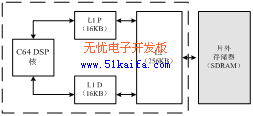 (1)存儲結(jié)構(gòu):DM642的存儲器系統(tǒng)由片內(nèi)內(nèi)存L1、L2和片外外存兩部分組成,L1,L2和片外SDRAM構(gòu)成了整個存儲器系統(tǒng)的三級層次結(jié)構(gòu),如圖2所示。其中,片內(nèi)內(nèi)存采用兩級緩存結(jié)構(gòu),第一級由L1P和L1D組成,L1距離DSP核最近,數(shù)據(jù)訪問速度最快,只需一個時鐘周期,只能作為不能尋址的Cache使用。第二級L2是一個統(tǒng)一的程序/數(shù)據(jù)空間,可以整體作為SRAM映射到存儲空間,也可以整體作為第二級Cache,或是二者按比例進(jìn)行組合。第三級是片外外存,一般由SDRAM構(gòu)成。L1Pcache大小為16KB,直接映射,每行大小32