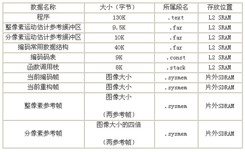 經(jīng)過優(yōu)化的程序和常用的數(shù)據(jù)結(jié)構(gòu)的大小可以放在L2中。所以按照上面的分析將L2配置為256KBSRAM,將程序代碼段(.text)、變量初值表(.cint)、常量字符串(.const)、全局變量靜態(tài)變量(.bss/.far)、堆棧段(.stack)等放入L2SRAM當(dāng)中,全局堆(.sysmem用于動態(tài)存儲器分配)置于外部存儲器。表1總結(jié)了編碼器所要用到的存儲空間分配情況。