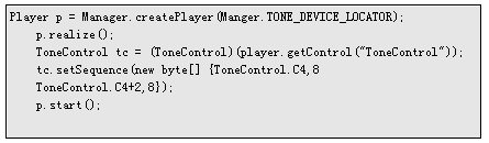 如果要播放序列音,則必須使用ToneControl。使用一個(gè)特別的定位器來創(chuàng)建一個(gè) Player對(duì)象,獲得ToneControl,設(shè)置其命令序列,然后啟動(dòng)播放器,如: