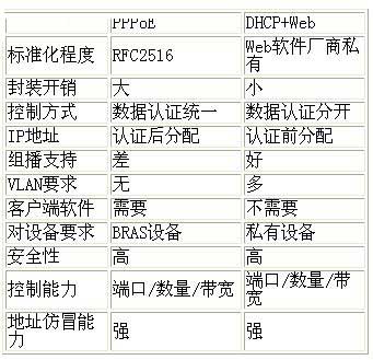 通過表1可以看出,DHCP+Web采用認證流和數(shù)據(jù)流相分離的方式,該方式?jīng)Q定了其對組播支持能力較強(只要局端設備支持),這種方式的帶寬利用率均較高,同時可以避免城域網(wǎng)匯聚層同時作為BRAS使用,對IPTV等寬帶業(yè)務非常適用。DHCP+Web方式可以對接入的用戶數(shù)量進行控制,由于采用Portal方式,其增值業(yè)務能力較強。從客戶端支持來看,由于DHCP+Web不需要客戶端軟件,避免了放號困難及維護工作量較大的問題?傮w而言,PPPoE技術(shù)成熟,效率低。