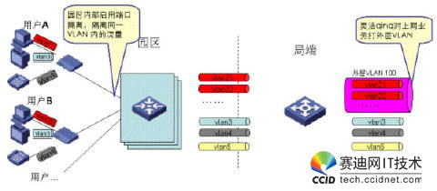 考慮到業(yè)務(wù)特性,上網(wǎng)業(yè)務(wù)通常需要對用戶進(jìn)行精細(xì)化管理,而對IPTV業(yè)務(wù)通常采用較粗獷的管理模式,因此我們建議通過如下方式來做VLAN規(guī)劃:對上網(wǎng)業(yè)務(wù),采用PUPV(每用戶一VLAN),對于IPTV/VOIP業(yè)務(wù),采用PSPV(每業(yè)務(wù)一VLAN),即同一園區(qū)內(nèi)的IPTV用戶采用同一VLAN,不同園區(qū)的IPTV/VOIP用戶采用不同的業(yè)務(wù)VLAN,在局端,通過靈活QINQ對上網(wǎng)業(yè)務(wù)的VLAN打外層標(biāo)簽,對于IPTV業(yè)務(wù)的VLAN不打外層標(biāo)簽。