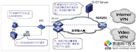 當(dāng)網(wǎng)絡(luò)設(shè)備收到STB的DHCP請求報(bào)文時(shí),需要在報(bào)文后添加OPTION82字段,此時(shí)有兩種模式進(jìn)行DHCP+認(rèn)證,一種是直接把DHCP報(bào)文送給DHCP服務(wù)器,由DHCP服務(wù)器根據(jù)OPT82字段來判斷該用戶是否為合法用戶,從而決定是否為其分配IP地址。另一種是DHCP報(bào)文先送到BRAS,由BRAS將OPT82字段放到RADIUS的一個(gè)子域里,通過RADIUS服務(wù)器來進(jìn)行用戶合法性認(rèn)證,若用戶合法,再由DHCP服務(wù)器分配IP地址。