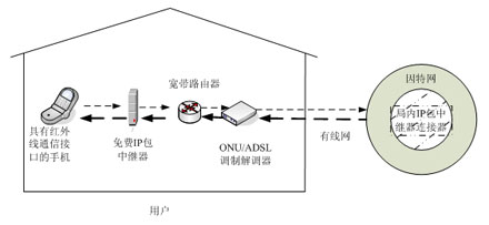 免費(fèi)IP包業(yè)務(wù)的最大特點(diǎn)就是,有線(xiàn)寬帶接入向手機(jī)用戶(hù)提供了免費(fèi)寬帶接入服務(wù)環(huán)境,這是通過(guò)在網(wǎng)中引入寬帶接入與手機(jī)的中繼設(shè)備而實(shí)現(xiàn)的,他們把該設(shè)備稱(chēng)作免費(fèi)IP包傳輸中繼器,該中繼器可以說(shuō)小巧玲瓏,它約10公分見(jiàn)方、高不足3公分,重量也僅有80克。在中繼器內(nèi)裝載了μITRON4.0標(biāo)準(zhǔn)的實(shí)時(shí)操作系統(tǒng),并具有紅外線(xiàn)通信接口(符合IrDAver.1.2標(biāo)準(zhǔn),最高速率為115.2kbit/s)和以太網(wǎng)接口(10/100Mbit/s),具有紅外線(xiàn)通信接口的手機(jī)(NTT