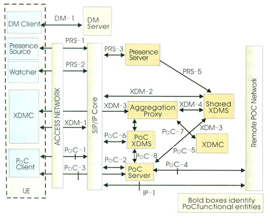 PoC業(yè)務(wù)需要外部實(shí)體配合提供,包括SIP/IP核心、共享XML文檔管理服務(wù)器(共享XDMS)、匯聚代理、在席服務(wù)器、在席信息源、觀(guān)察者、計(jì)費(fèi)實(shí)體和設(shè)備管理等,其中主要有: