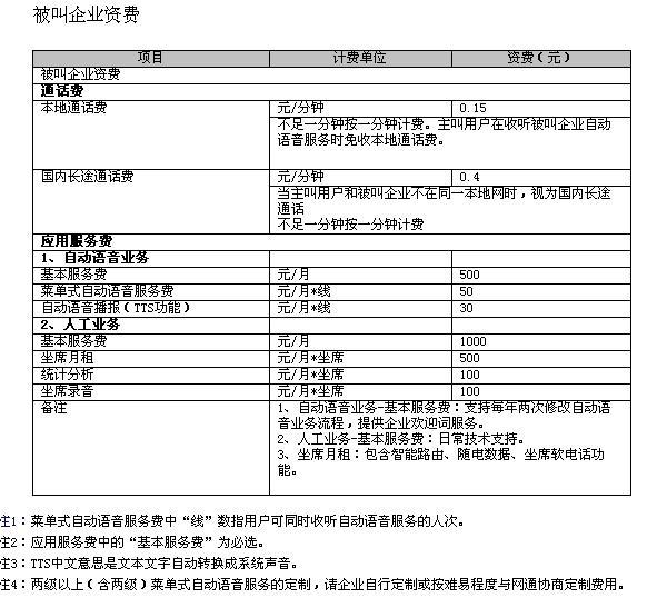 2、被叫企業(yè)資費標(biāo)準(zhǔn)如下: