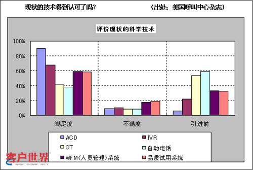 這是調查美國客服中心的管理者們如何評價自己公司引進技術的統(tǒng)計表。雖然“滿意”并不意味著“相關技術被有效利用”?墒菑恼{查結果來看,他們對技術的滿意度相當高,并且看起來都在有效利用相關技術。