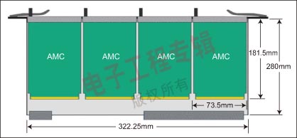 為了提高ATCA設(shè)計的模塊化性能,PICMG開發(fā)了高級夾層卡(AMC)規(guī)范。在ATVA卡上放置這些模塊后就可以使它們訪問背板連接,因此這些模塊可以用來定制ATCA卡上的I/O,并用來裝載處理器和存儲外設(shè)。一塊ATCA卡最多能夠放4個AMC模塊(見圖1),因此設(shè)計師用一個卡即可實現(xiàn)多種不同的配置。就像ATCA卡一樣,AMC模塊同樣可以實現(xiàn)單個模塊的遠程系統(tǒng)管理和熱交換功能。