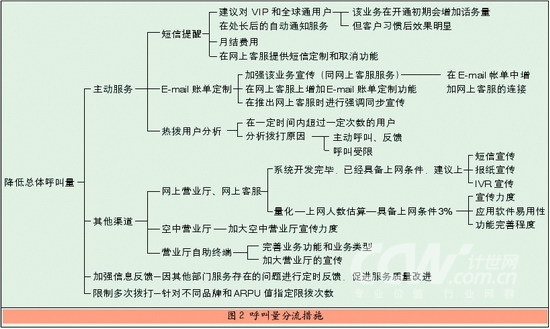 在給某移動運(yùn)營商進(jìn)行的接通率優(yōu)化咨詢項目中,利用呼叫中心接通率優(yōu)化模型進(jìn)行了分析,圖2是針對分流呼叫中心總體呼叫量所提出的建議措施。