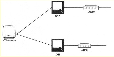 下一代媒體網(wǎng)關(guān)系統(tǒng)主要由媒體網(wǎng)關(guān)、媒體網(wǎng)關(guān)控制器和信令網(wǎng)關(guān)組成,實現(xiàn)了功能上的分解。為了適應不同的網(wǎng)絡(luò),本文主要介紹了媒體網(wǎng)關(guān)的實現(xiàn)方法,其中媒體網(wǎng)關(guān)的主要作用是實現(xiàn)模擬信號由電路交換轉(zhuǎn)換成數(shù)字信號PCM編碼,并進行G.711或者G.723等格式編碼。為了實現(xiàn)媒體網(wǎng)關(guān),整個系統(tǒng)由3部分組成,包括基于ARM架構(gòu)的嵌入式系統(tǒng)(uClinux)、語音信號轉(zhuǎn)換芯片(TLC320AD50)和定點數(shù)字信號處理器(TMS320VC54xx),如圖3所示。