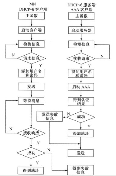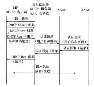 當(dāng)DHCPv6服務(wù)器調(diào)用子進程執(zhí)行AAA客戶端程序后,AAA客戶端將把從MN傳過來的密碼和用戶名添加到認證請求選項中,向AAAL進行認證。AAAL將收到的消息轉(zhuǎn)發(fā)給AAAH服務(wù)器,AAAH收到認證請求后進行認證。如用戶名和密碼正確,則返回Accecpt響應(yīng)消息,標(biāo)志認證成功;如用戶名或者密碼錯誤,則返回Reject響應(yīng)消息,標(biāo)志認證失敗。AAAL收到認證回復(fù)消息后記錄認證信息,下次認證時只需詢問AAAL,減少認證步驟。
