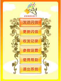 “閃信”的主操作界面設(shè)計(jì)簡潔、顏色以明快的橙色位置。功能選項(xiàng)整齊的排列在屏幕中央。功能項(xiàng)共分為6大項(xiàng)“發(fā)送閃信、收發(fā)記錄、更新閃信、參數(shù)設(shè)置、使用幫助、退出系統(tǒng)”功能項(xiàng)的設(shè)置簡潔,功能名稱使人看過之后就可以迅速理解了各個選項(xiàng)的功能重點(diǎn)。