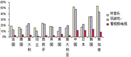 除打電話、發(fā)短信、拍照、手機郵箱以外,音樂、游戲也是用戶每周使用較多的業(yè)務。當被問及其它應用時,來自中國、新加坡還有韓國的部分被調查者表示,他們會經常用手機來聽音樂和玩游戲。其中,中國是惟一一個選擇用手機聽音樂的用戶數(shù)與選擇用手機拍照的用戶數(shù)旗鼓相當?shù)膰。但有趣的是,手機在中國不太可能成為MP3的替代品,仍然只是一個便攜播放器。在新加坡,手機替代MP3的可能性就大多了。Ovum認為,這是由于高端手機在新加坡市場占有很高的比例。在歐洲和美國,使用手機來聽音樂和玩游戲的比例則比亞洲少了很多,但值得鼓勵的是仍有超過10%的被調查者選擇了該答案。(見圖2)