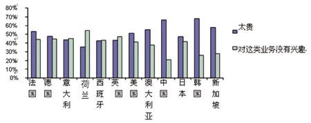 除了每周使用量之外,Ovum還向被調查者詢問是什么因素阻礙了他們通過手機應用上述程序,被提及的最大顧慮是價格昂貴,其次是沒有興趣。在歐洲一些國家,對業(yè)務不感興趣是和費用昂貴同等重要的原因,在荷蘭,選擇對移動業(yè)務不感興趣的比例甚至超過了認為費用昂貴的比例。此外很有趣的是,沒有一個被調查者表示因為手機沒有這些功能而導致無法使用業(yè)務。(見圖4)